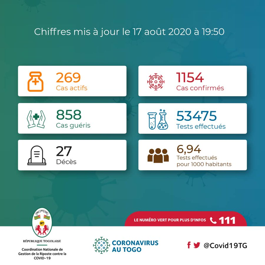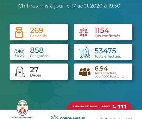 • Coronavirus - Togo : Chiffres mis à jour le 17 août 2020 à 19:50