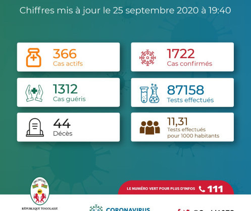 • Coronavirus - Togo : Chiffres mis à jour le 25 septembre 2020 à 19:40