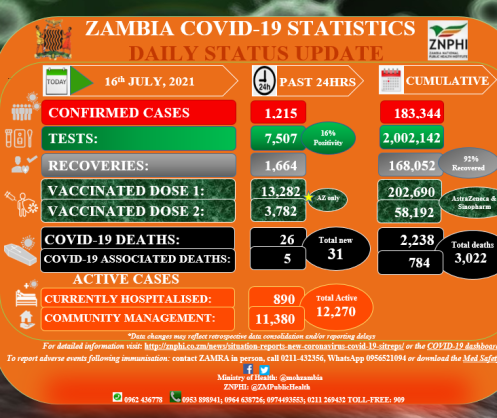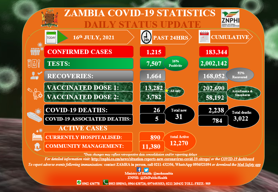 Coronavirus - Zambia: COVID-19 Daily Info Update (July 16, 2021)