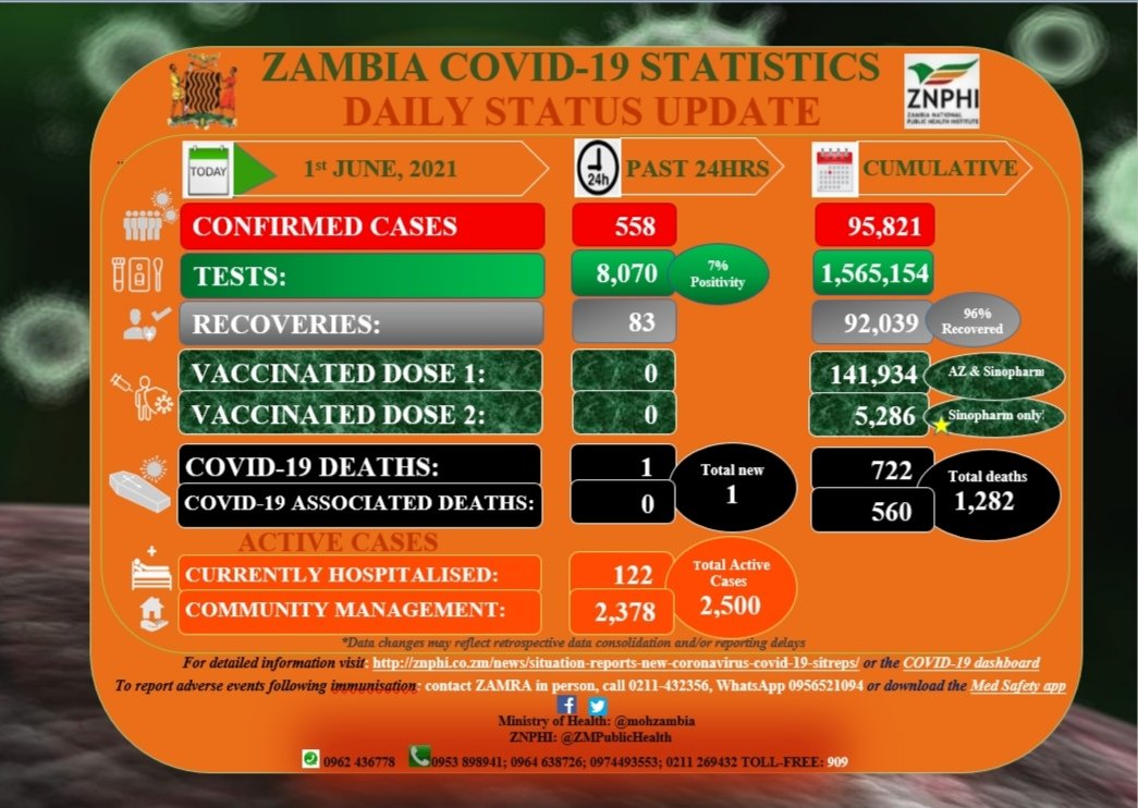 • Coronavirus - Zambia: COVID-19 Daily Statistics Update (1 June 2021)