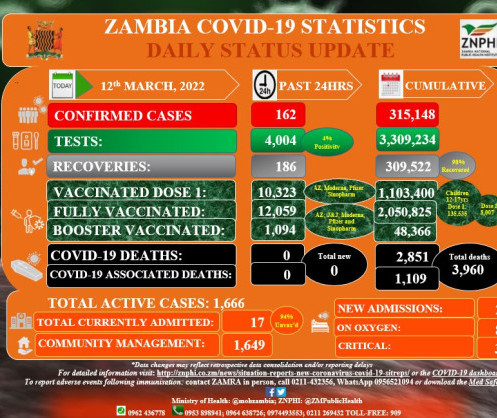 • Coronavirus - Zambia: COVID-19 Statistics Daily Status Update (12 March 2022)