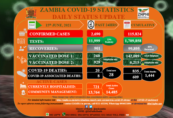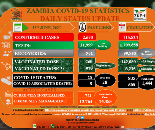 • Coronavirus - Zambia: COVID-19 Statistics Daily Status Update (15 June 2021)
