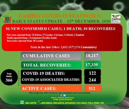 • Coronavirus - Zambia: Daily status update (12th December 2020)