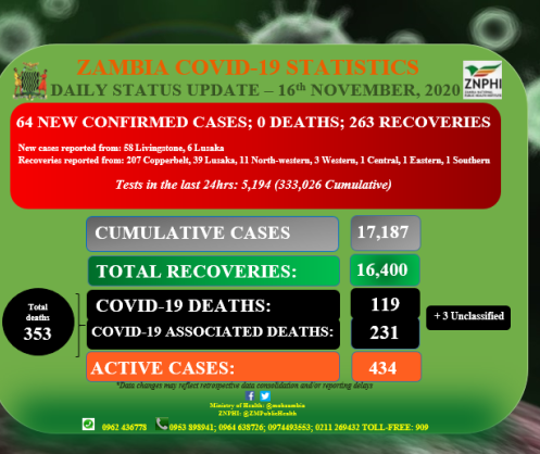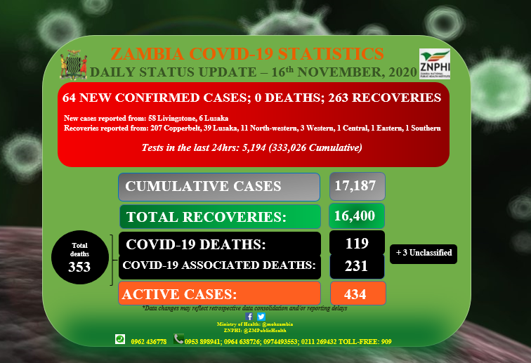 • Coronavirus - Zambia: Daily status update (16th November 2020)