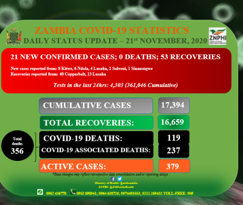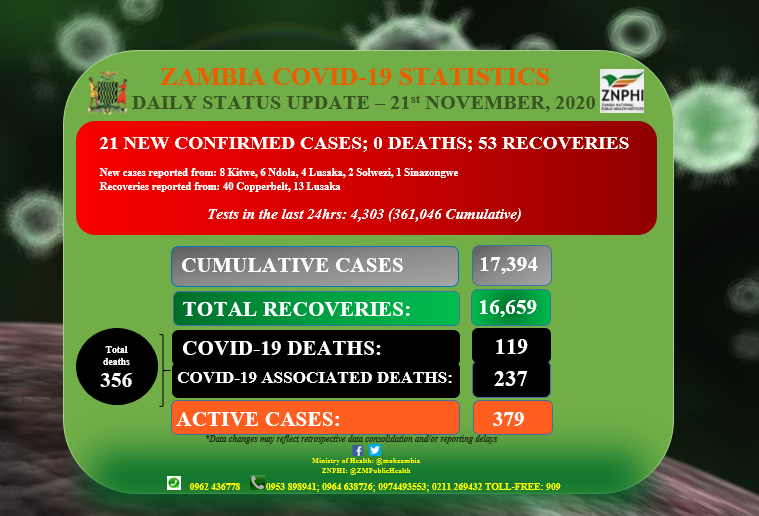 • Coronavirus - Zambia: Daily status update (21st November 2020)