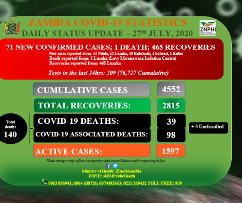 Coronavirus - Zambia: Daily Status Update 27th July 2020