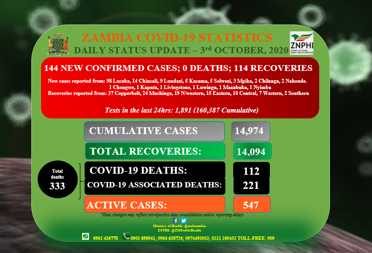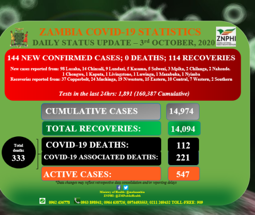 • Coronavirus - Zambia: Daily status update (3 October 2020)