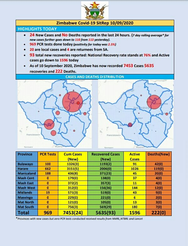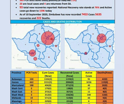 As at 10 September 2020, Zimbabwe had 7 453 confirmed cases, including 5 635 recoveries and 222 deaths.