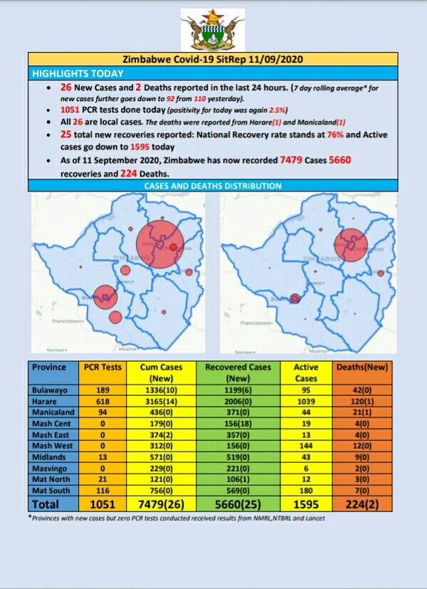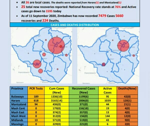 As at 11 September 2020, Zimbabwe had 7 479 confirmed cases, including 5 660 recoveries and 224 deaths.