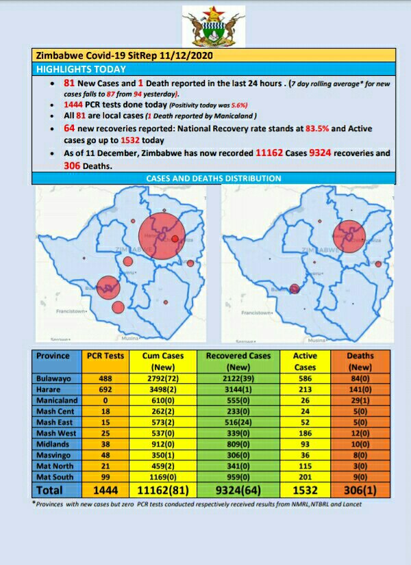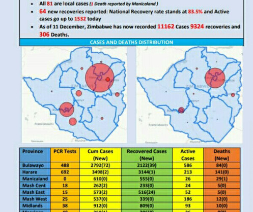 As at 11 December 2020, Zimbabwe had 11 162 confirmed cases, including 9 324 recoveries and 306 deaths.