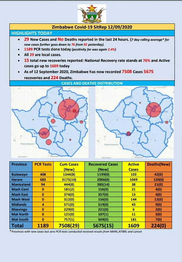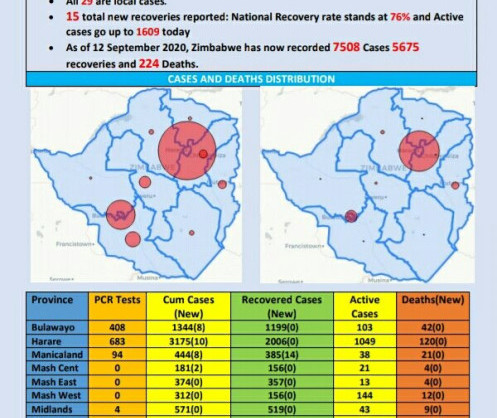 As at 12 September 2020, Zimbabwe had 7 508 confirmed cases, including 5 675 recoveries and 224 deaths.