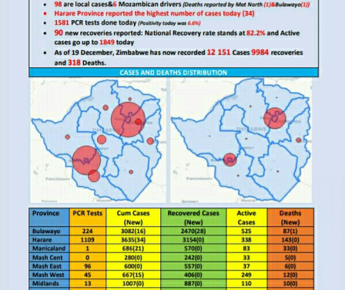 As at 19 December 2020, Zimbabwe had 12 151 confirmed cases, including 9 984 recoveries and 318 deaths.