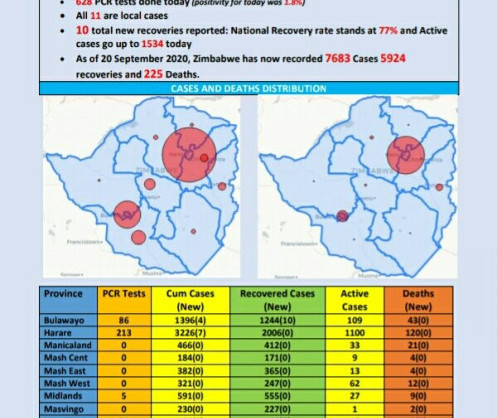 As at 20 September 2020, Zimbabwe had 7 683 confirmed cases, including 5 924 recoveries and 225 deaths.