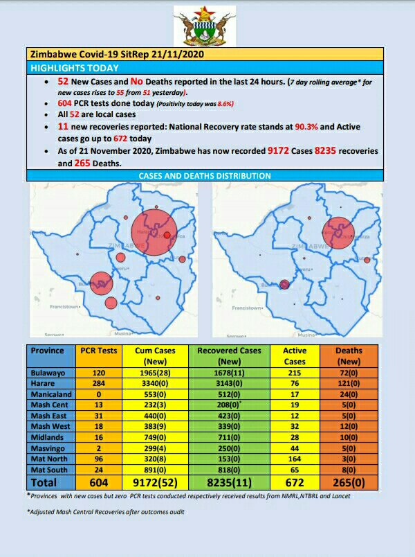 As at 21 November 2020, Zimbabwe had 9 172 confirmed cases, including 8 235 recoveries and 265 deaths.