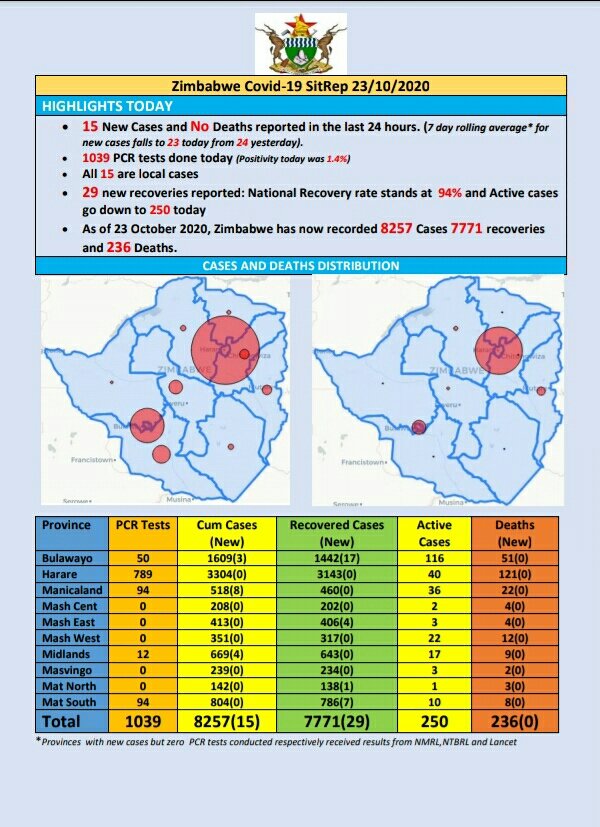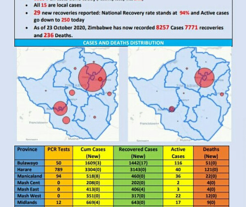 COVID-19 update: As at 23 October 2020, Zimbabwe had 8 257 confirmed cases, including 7 771 recoveries and 236 deaths.