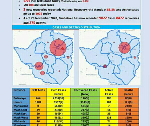 As at 28 November 2020, Zimbabwe had 9 822 confirmed cases, including 8 472 recoveries and 275 deaths.