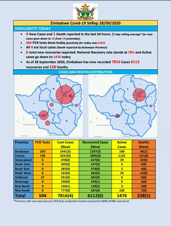COVID-19 update: As at 28 September 2020, Zimbabwe had 7816 confirmed cases, including 6112 recoveries and 228 deaths.
