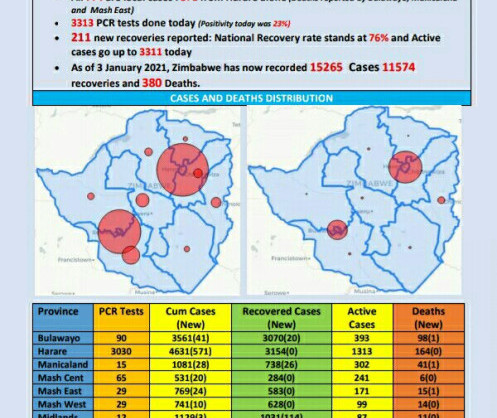 As at 03 January 2021, Zimbabwe had 15 265 confirmed cases, including 11 574 recoveries and 380 deaths.