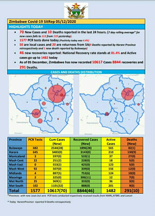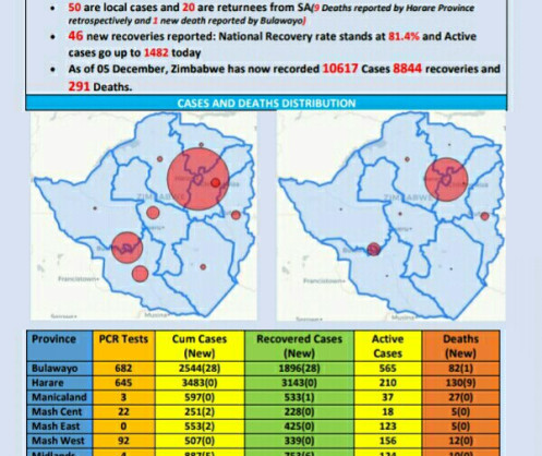 As at 05 December 2020, Zimbabwe had 10 617 confirmed cases, including 8 844 recoveries and 291 deaths.