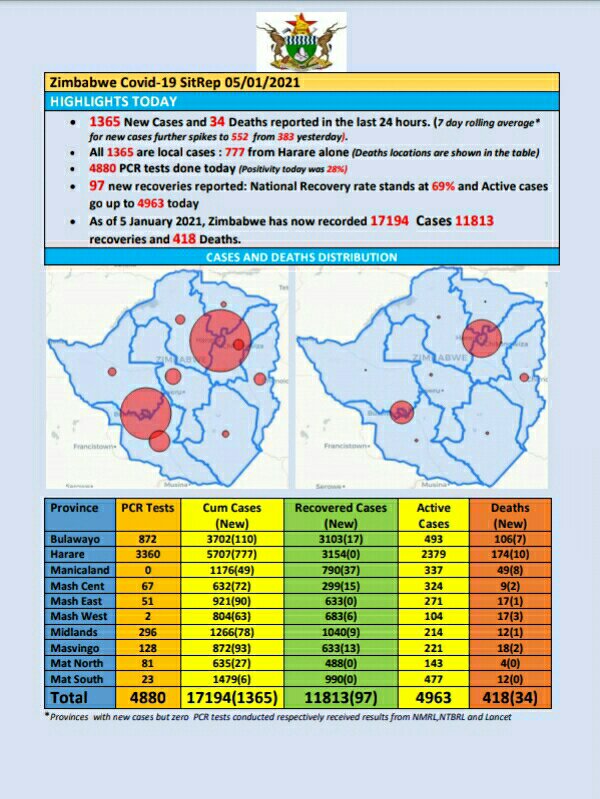 As at 05 January 2021, Zimbabwe had 17 194 confirmed cases, including 11 813 recoveries and 418 deaths.