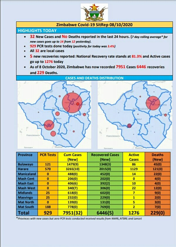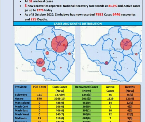 COVID-19 update: As at 08 October 2020, Zimbabwe had 7951 confirmed cases, including 6446 recoveries and 229 deaths.