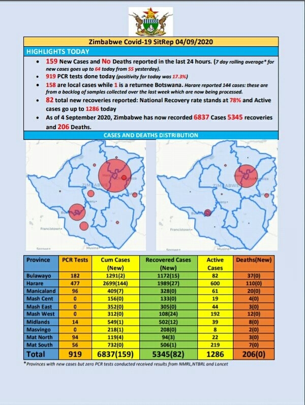 As at 04 September 2020, Zimbabwe had 6 837 confirmed cases, including 5 345 recoveries and 206 deaths.
