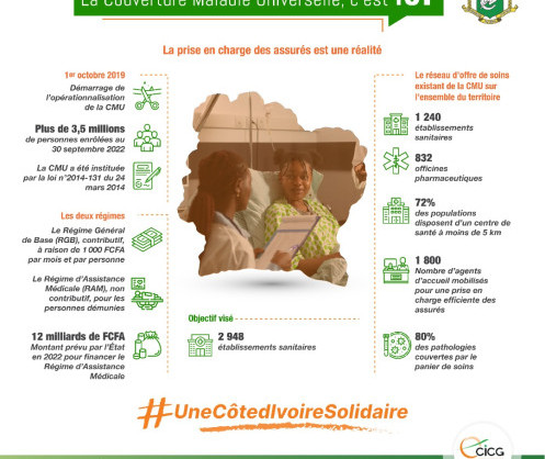 L’opérationnalisation de la CMU a démarré le 1er octobre 2019. Pour accompagner la mise en place, l’Etat a réalisé de nombreux investissements afin de financer la réalisation d’infrastructures sanitaires, mais aussi le recrutement des ressources humaines adaptées. « Nous avons construit, réhabilité et/ou équipé 312 Établissements Sanitaires de Premier Contact, 5 Hôpitaux Généraux, 8 Centres Hospitaliers Régionaux et lancé les travaux du plus grand CHU du pays, celui d’Abobo. Le taux d’accès des populations disposant d’un centre de santé à moins de 5 km est aujourd’hui de 72% et ne cesse de s’améliorer », a rappelé le Premier Ministre Patrick Achi lors de sa conférence de presse du 21 novembre 2022.