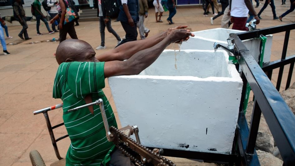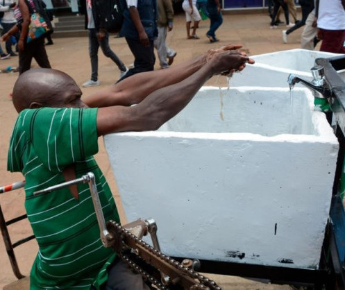 - Un homme en fauteuil roulant est représenté en train de se laver les mains dans un robinet d'eau public à Nairobi, au Kenya, à titre préventif contre COVID-19, le 22 mars 2020. © 2020 Dennis Sigwe / SIPA via AP Images