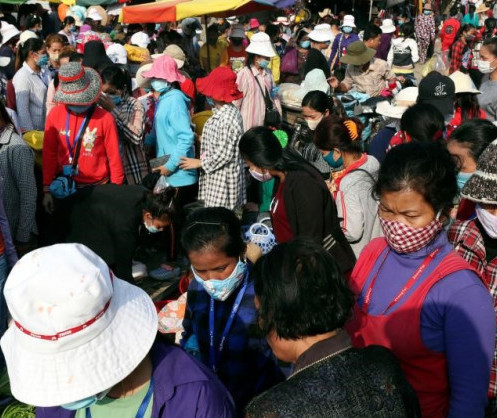 - Les travailleurs des usines de confection portent des masques faciaux à la fin de leur quart de travail le 20 mars 2020, près de Phnom Penh, au Cambodge. © 2020 AP Photo / Heng Sinith