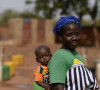 • أم تحمل ابنها في أحد مواقع الأسر النازحة داخلياً في واهيغويا، شمال بوركينا فاسو. © UNHCR/Benjamin Loyseau