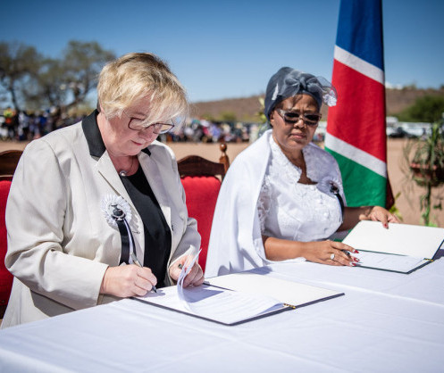 Immediately following her arrival, Minister Bauer met with Namibian Minister of Education, Arts and Culture, Katrina Hanse-Himarwa. Together with her delegation, they accompanied the Witbooi Bible and whip on their way to Gibeon, the historic home of the Witbooi family, where the official hand-over ceremony took place on 28 February. She personally handed over the Bible and whip to the President of the Republic of Namibia, Dr. Hage G. Geingob, who in turn gave them to the elders of the Witbooi family. The elders then handed the artefacts over to Minister Hanse-Himarwa for care and custody by the Ministry.