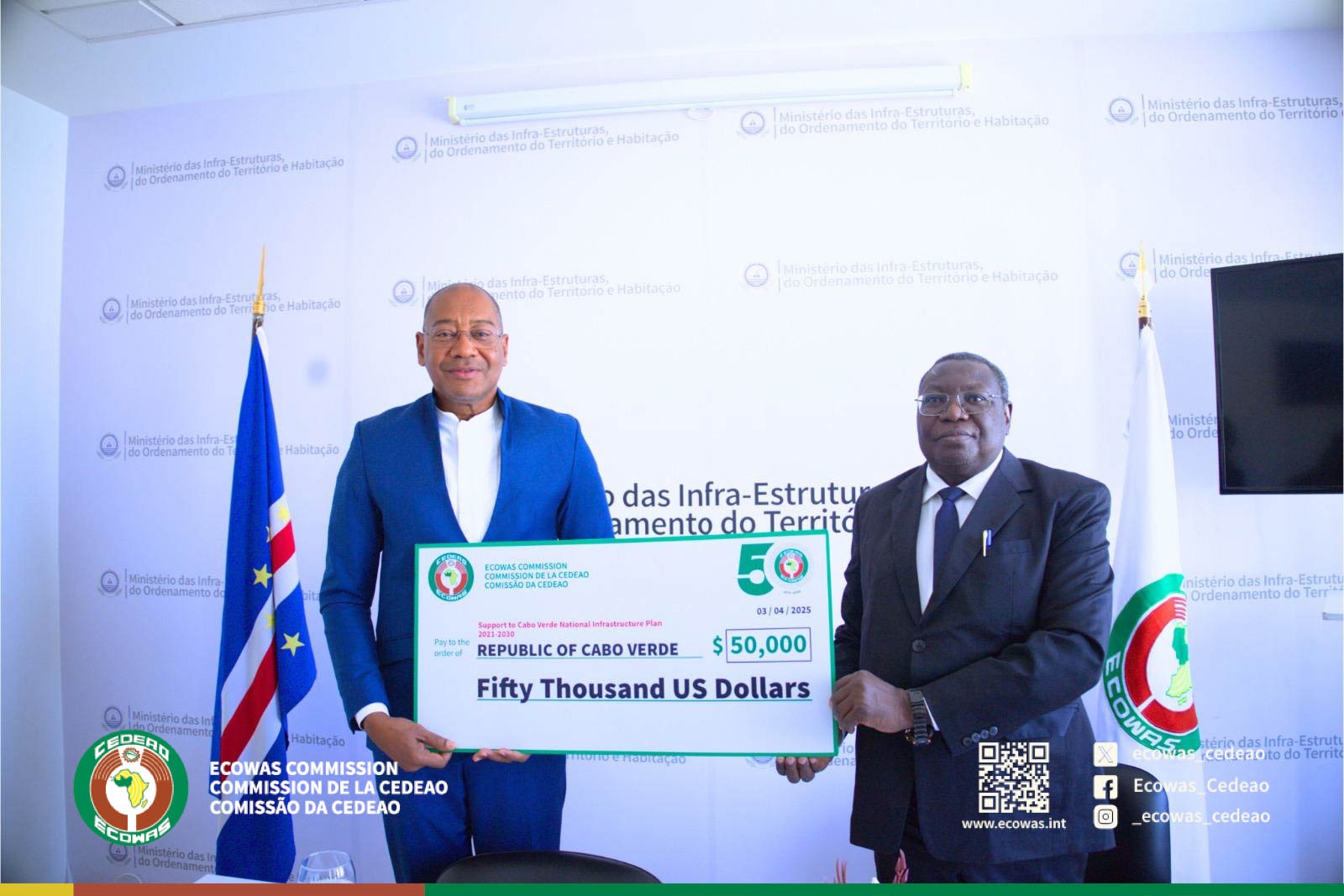 For his part, the Minister for Infrastructure, Spatial Planning and Housing, Victor Coutinho, thanked the ECOWAS Commission for its support. He reiterated that this National Infrastructure Master Plan 2025-2024 will provide a comprehensive framework covering all sectors of economic and social infrastructure to stimulate economic development, growth and regional integration in Cape Verde. The statements were followed by the symbolic presentation of a cheque for USD 50,000.