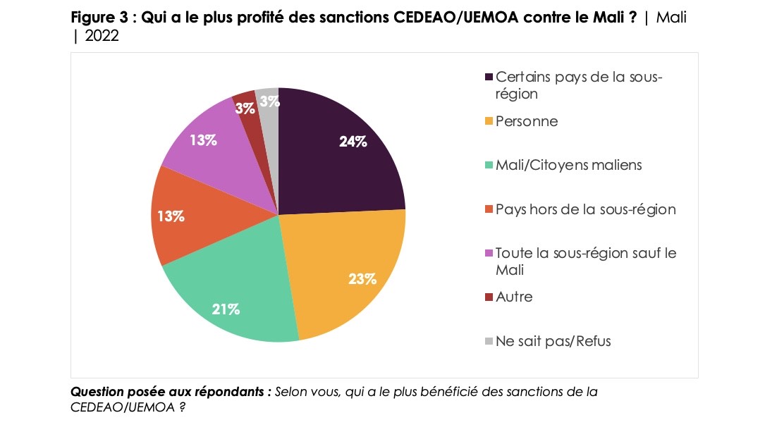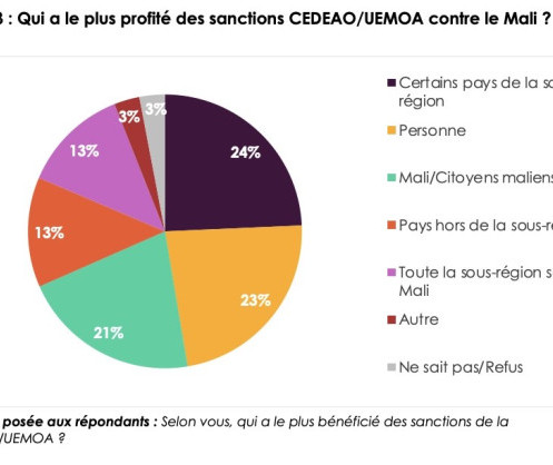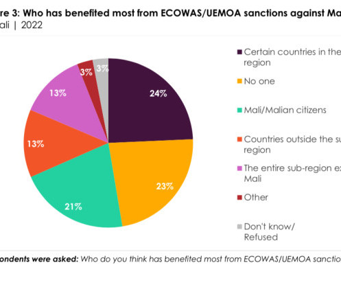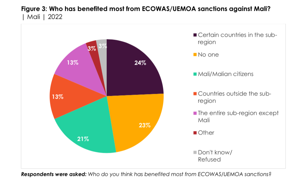 • Only two in 10 Malians (21%) said in 2022 that the country or its citizens have been the primary beneficiaries of the sanctions. Many said the sanctions have mainly benefited certain countries in the sub-region (24%) or no one (23%) (Figure 3).