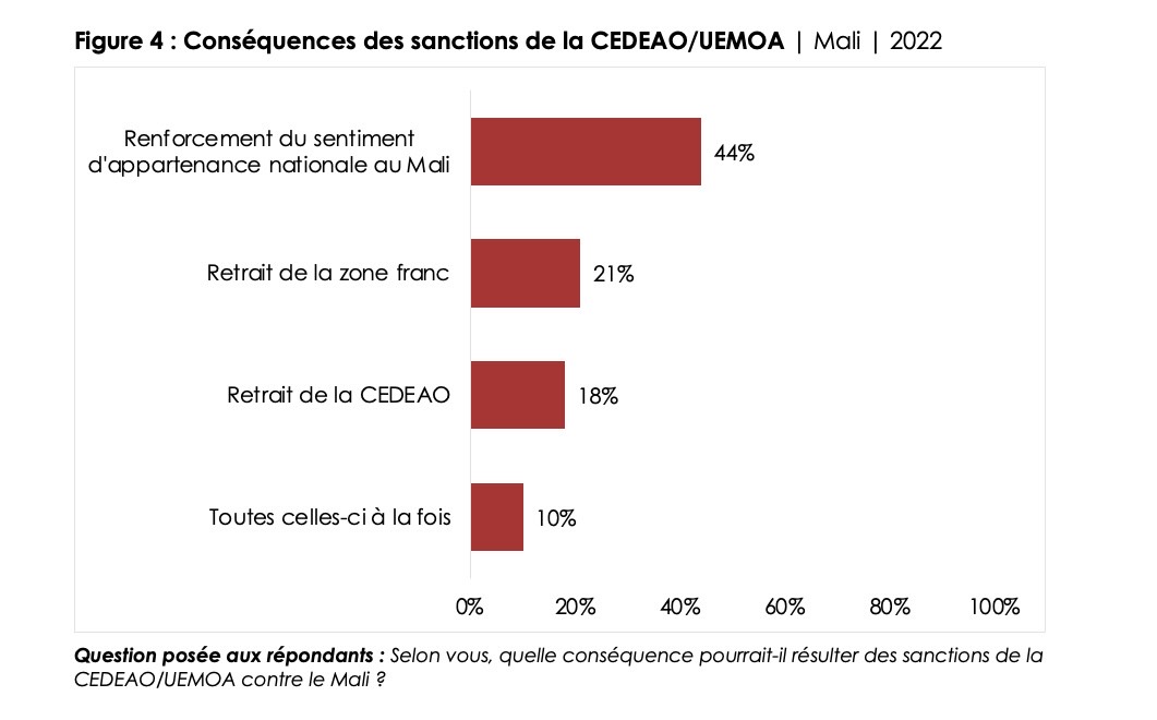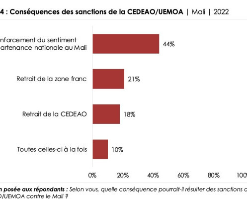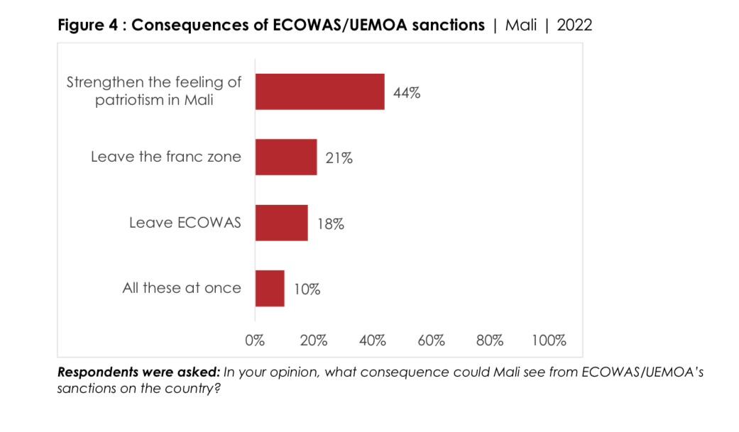 • When asked about likely consequences of the sanctions, only two in 10 Malians (18%) cited withdrawal from ECOWAS (Figure 4). The largest share (44%) said it would lead to the strengthening of patriotism in the country, while 21% mentioned withdrawal from the franc zone, and 10% considered all three of these consequences likely.