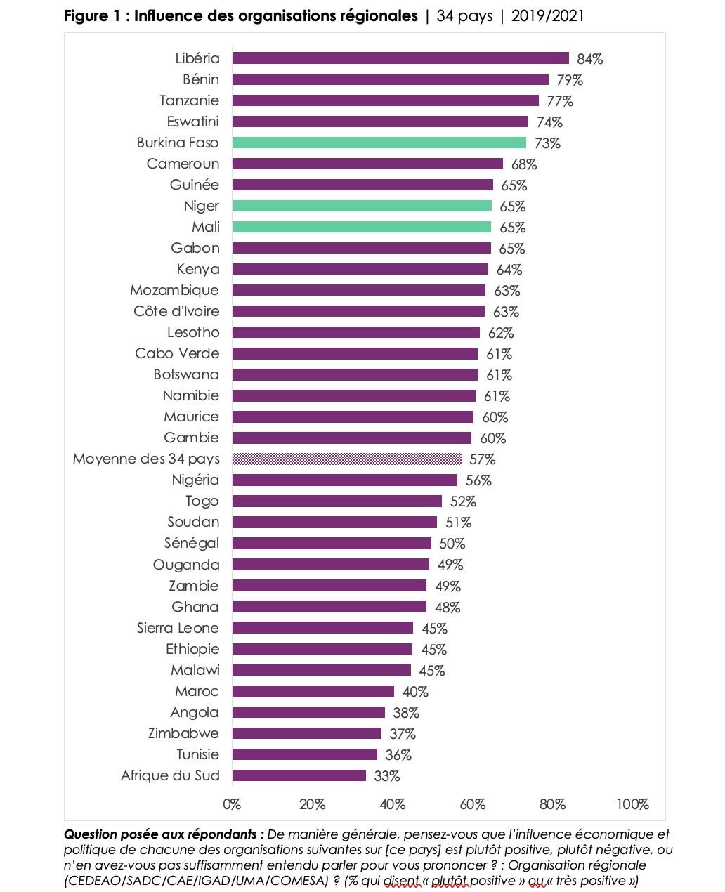 • In comparison, the AU’s influence won positive assessments from 71% of Burkinabè, 59% of Malians, and 58% of Nigeriens.