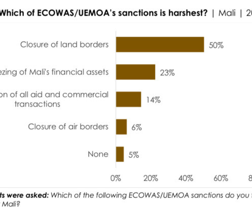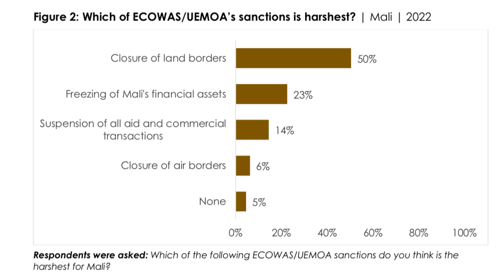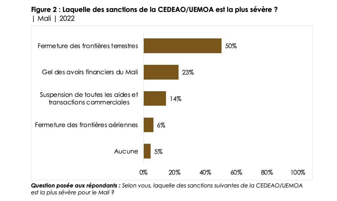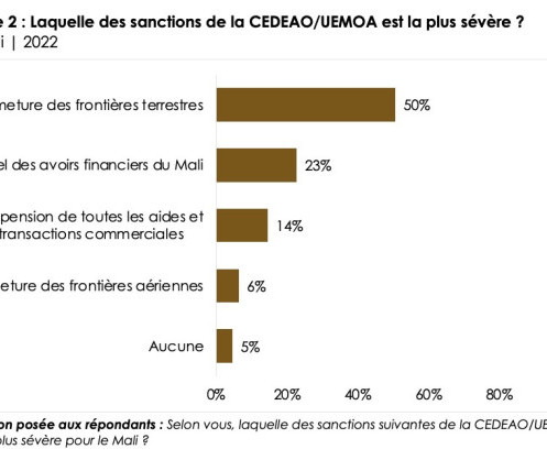 • In Afrobarometer’s 2022 survey in Mali, citizens cited the closure of land borders (50%), freezing of the country’s financial assets (23%), and suspension of aid and commercial transactions (14%) as the most serious ECOWAS/UEMOA sanctions against their country (Figure 2).