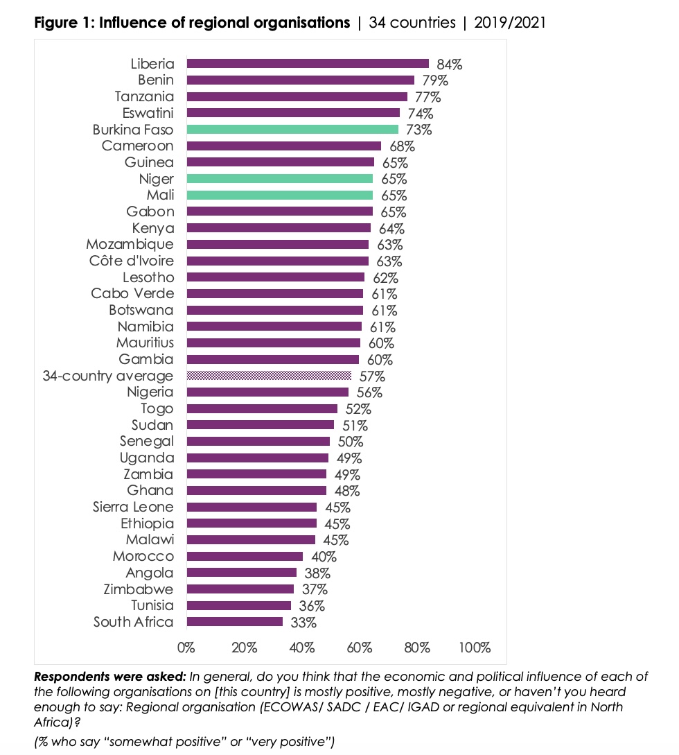Afrobarometer surveys conducted in 2019/2021 showed that citizens in the three countries held largely favourable views of ECOWAS, rating its economic and political influence more positively than that of the African Union