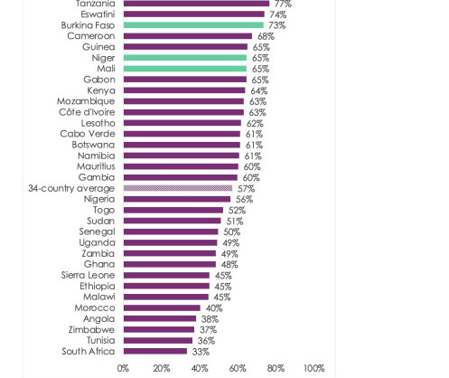 Citizens’ positive ratings of ECOWAS influence in Burkina Faso (73%), Mali (65%), and Niger (65%) were well above the continental average
