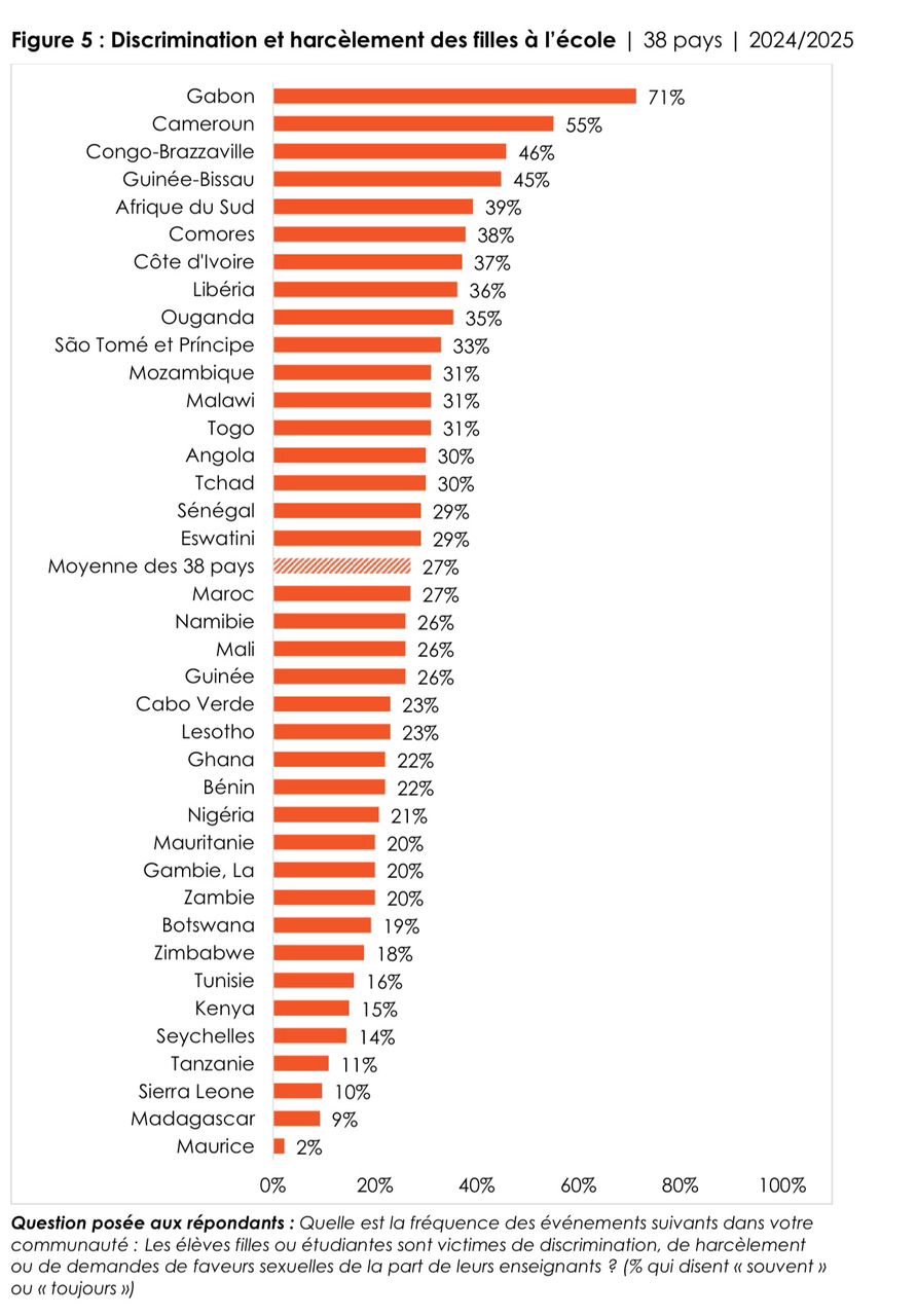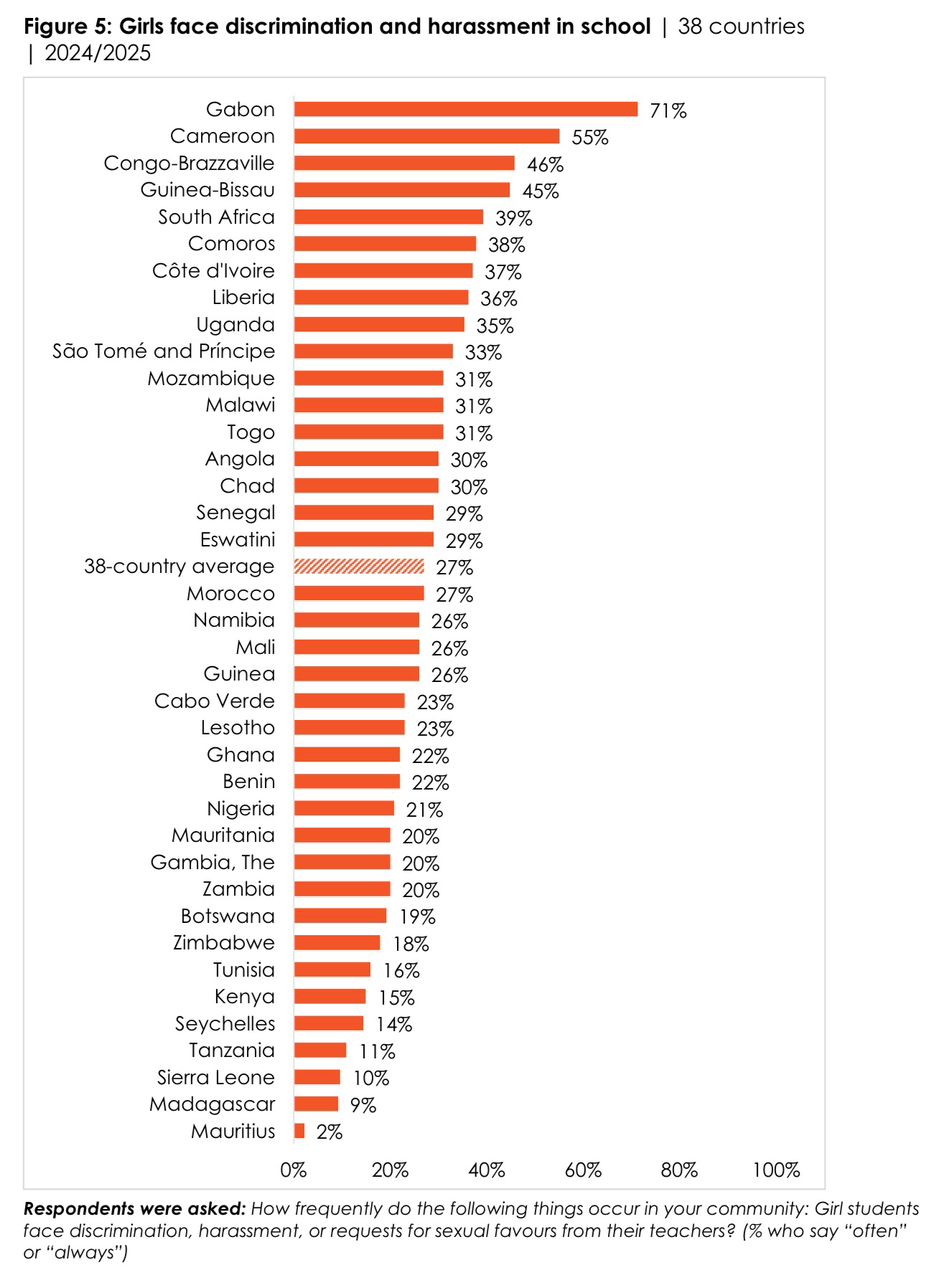 • But there is huge variation by country: Seven in 10 Gabonese (71%) and more than half (55%) of Cameroonians report that girl students frequently experience such treatment, while fewer than one in 10 say the same in Madagascar (9%) and Mauritius (2%) (Figure 5).