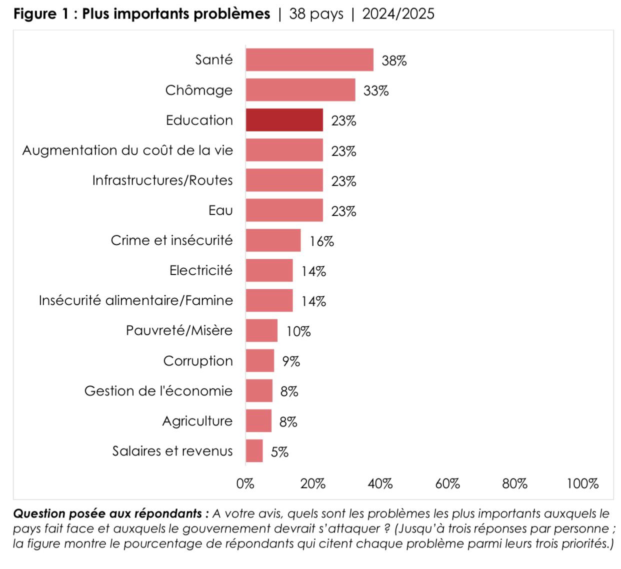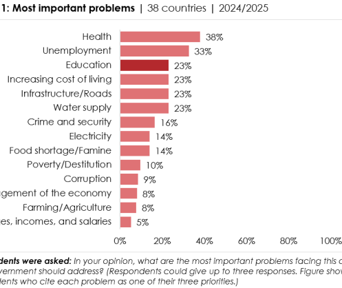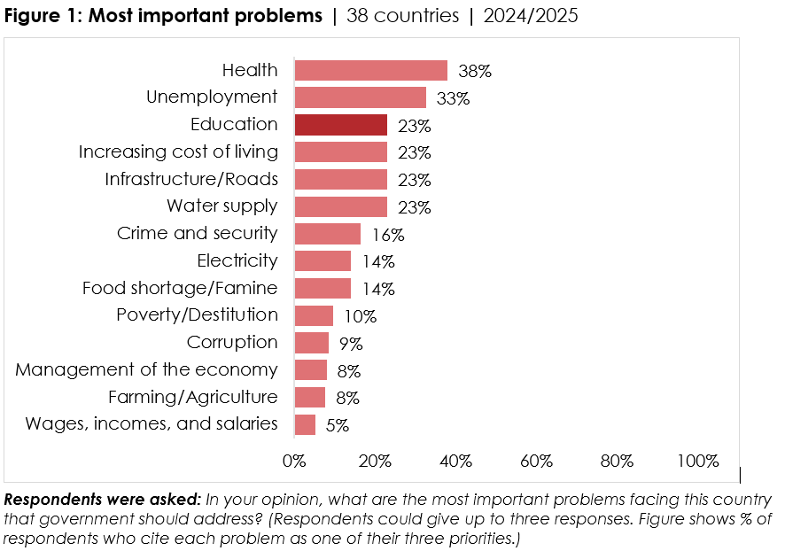 • On average across 38 countries, education places third on Africans’ list of most important problems that their governments should address, up from sixth place in 2021/2023 (Figure 1).