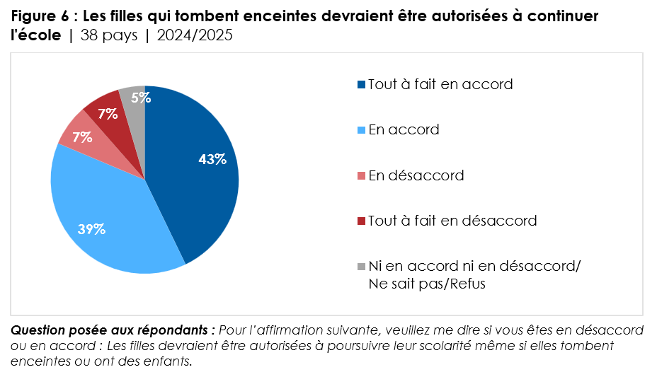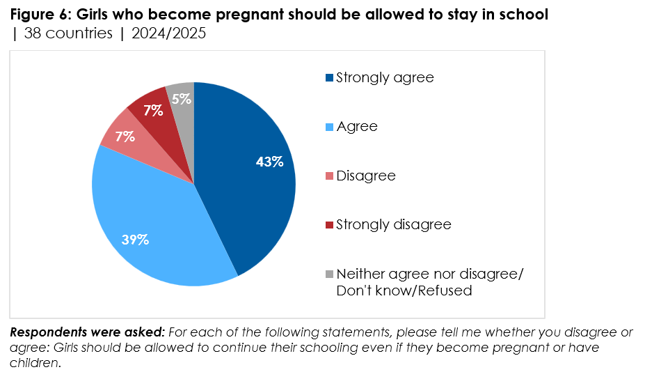 • Citizens overwhelmingly (81%) endorse allowing girls who become pregnant or have children to continue their education, including 43% who “strongly agree” with the idea (Figure 6).
