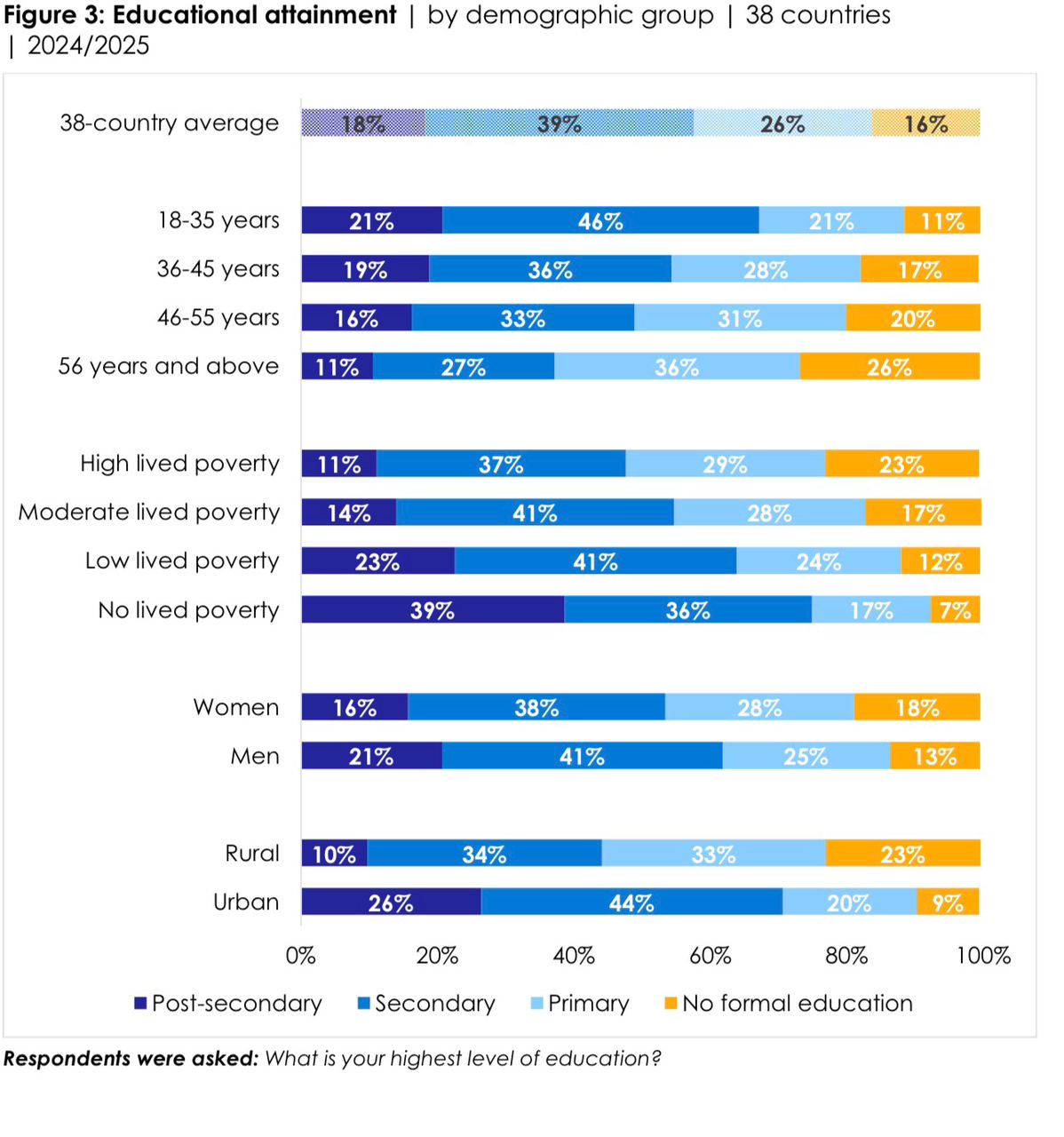 While younger citizens have more education than their elders, educational attainment varies widely by country and reflects persistent disadvantages among women, the poor, and rural residents.