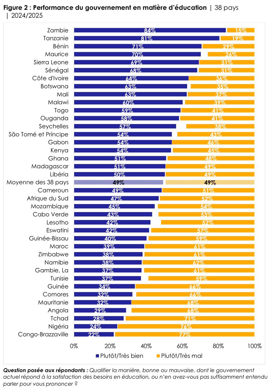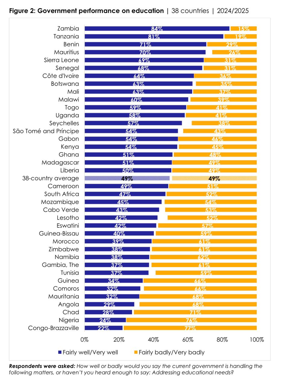 • Only half (49%) of respondents think their government is performing “fairly well” or “very well” on education, while the other half (49%) give their leaders poor marks (Figure 2).