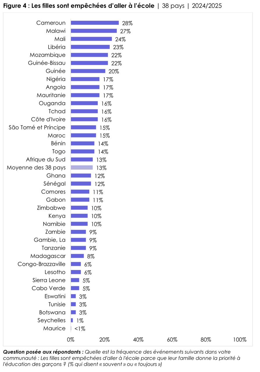 • Only 13% of respondents say girls are “often” or “always” prevented from attending school because their families prioritise boys’ education, though this figure ranges up to 27% in Malawi and 28% in Cameroon (Figure 4).