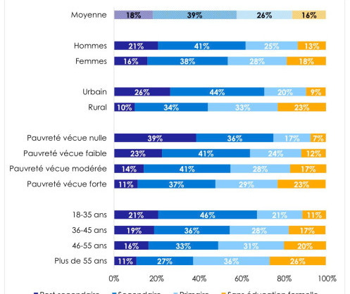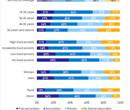 • Nearly two in 10 adults (18%) have post-secondary education, while a similar proportion (16%) report having no formal schooling. The largest share (39%) claim secondary school as their highest level of education, while 26% have primary schooling (Figure 3).