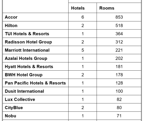 When one considers existing hotels, as well as hotels in the development pipeline, the continent’s current king of the jungle is Accor, with 165 hotels, containing 29,041 rooms, open and trading. Marriott International is in second place, 25,451 rooms in 143 hotels, Hilton is third, 12,525 rooms in 47 hotels and Radisson Hotel Group is close behind with 12,179 rooms in 61 properties. However, if Marriott International delivers all the rooms in its pipeline, it is on course to overtake Accor and become pack leader, with 51,816 rooms in operation.