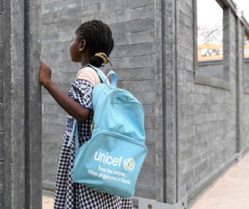• UNICEF / Frank Dejongh | Une écolière regarde la construction de sa nouvelle école en briques de plastique recyclé à Sakassou, un village du centre de la Côte d'IvoireUNICEF / Frank Dejongh | Une écolière regarde la construction de sa nouvelle école en briques de plastique recyclé à Sakassou, un village du centre de la Côte d'Ivoire