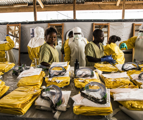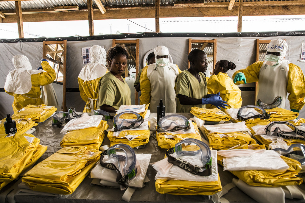• Banque mondiale / Vincent Tremeau | Des agents de santé revêtent leur équipement de protection individuelle avant d'entrer dans la zone où les personnes potentiellement atteintes du virus Ebola sont placées en quarantaine pour être suivies et traitées (janvier 2019)