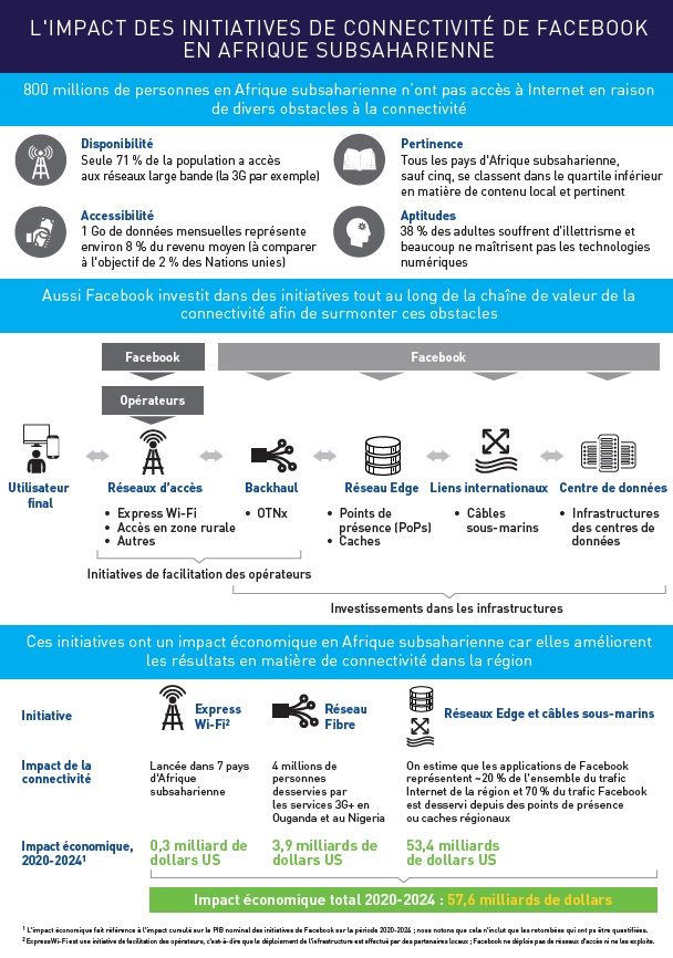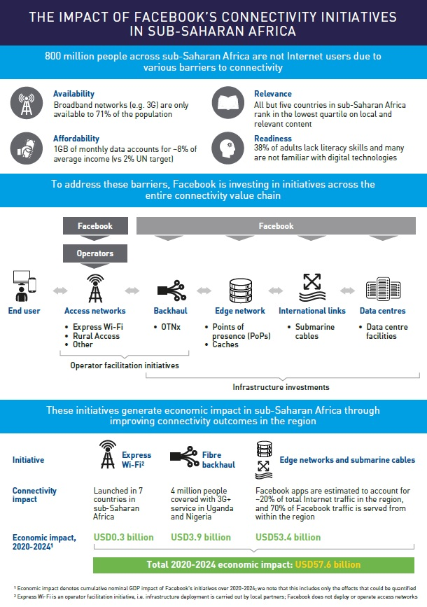 Selon l'Economist Intelligence Unit - Inclusive Internet Index 2020, plus de 800 millions de personnes en Afrique subsaharienne ne sont pas connectées à Internet. Depuis plusieurs  années, Facebook investit dans des infrastructures et des partenariats afin d'éliminer les obstacles à la connectivité, tels que le manque d’infrastructures ou le coût de l’accès à internet. Les investissements en infrastructures et les initiatives de connectivité de Facebook visent également à proposer des apports financiers et techniques qui peuvent rendre les infrastructures plus faciles et moins coûteuses à déployer sur le continent. Cela comprend: