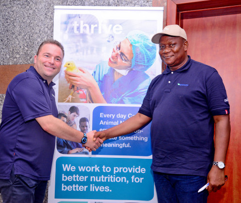 • Shaking hands at the educational poutry seminar, hosted by Farm Support Services, at Ibadan: (from left) Ercole Pavesi, Regional Director Sub-Saharan Africa for Cargill's animal nutrition business; and Olumide Origunloye, Managing Director of Farm Support Services